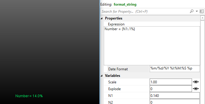 In format_string, you can use the “%” format specifier to automatically format as percentage. For example, using {N1:.1%} will show a percentage with one decimal point of precision: