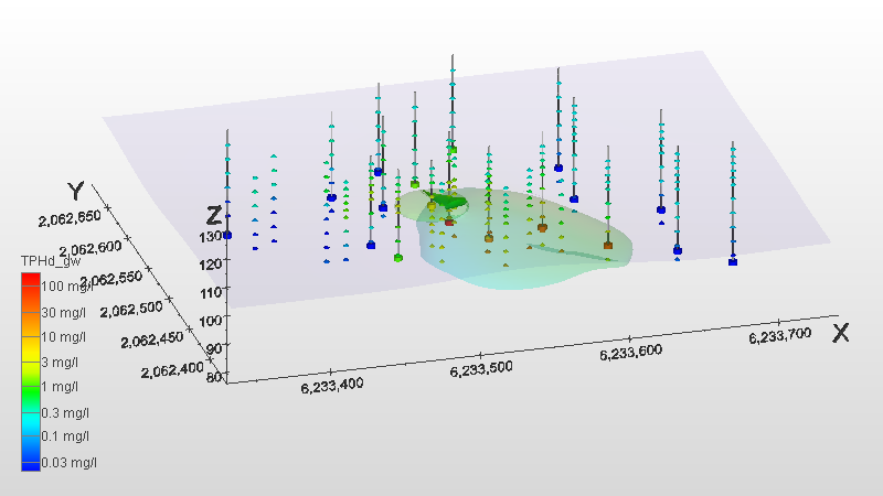 In the picture above, we’ve used “cone” glyphs to represent the soil sample locations which now are colored by groundwater concentration. I chose cones because they point upwards towards the vadose (soil) zone! The (very limited) source groundwater data is represented by the larger short cylinders.