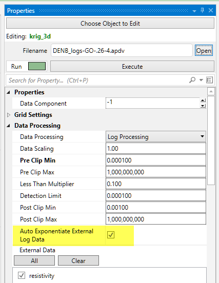 - If you’re using the external data input port and the input data is log data, make sure you keep the “Auto Exponentiate External Log Data” toggle ON, and use Log Processing for your kriging.