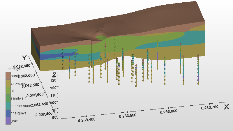 Note above that the soil location points with Lithology mapped to them are shown as cubes, whereas the Source PGF data is displayed with post_samples as tubes. In this case, the soil points were collected along the same borings used for the lithology data (.pgf file), but using this method, that would not be required.