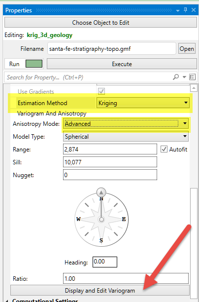 To achieve smoothing we need to take advantage of some of the advanced options, most specifically the Nugget term. Choose the settings below and click on “Display and Edit Variogram”