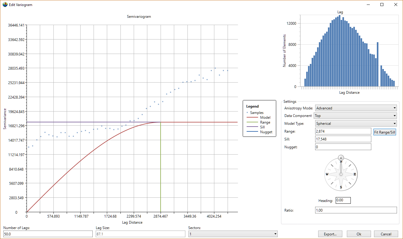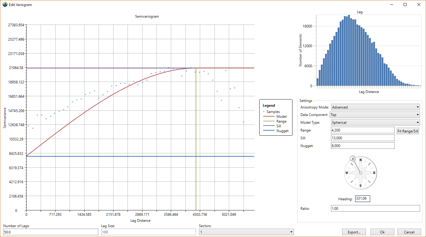 When you do that, the window below will open. You may be surprised by the apparent “poor” fit of the expert system’s best fit variogram. However, you need to remember that it is a constrained best-fit and those constraints are rather complex (and not published). You can always adjust these, but if/when you do, we would advise you to follow these guidelines:
