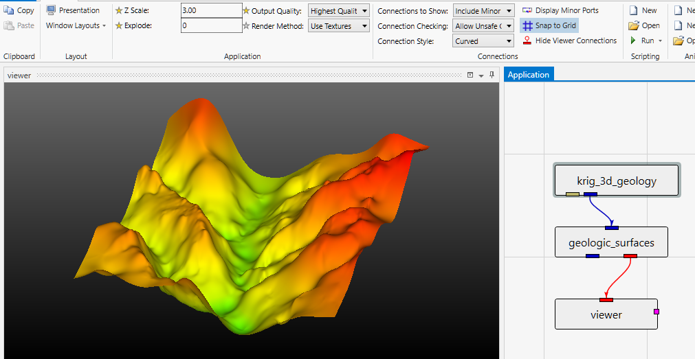 If we add a geologic_surfaces module we can see the first of the stratigraphic surfaces. The selected Estimation Method for this application is Natural Neighbors with the Gradients option on. This tends to give us the smoothest surfaces that still honor our data.