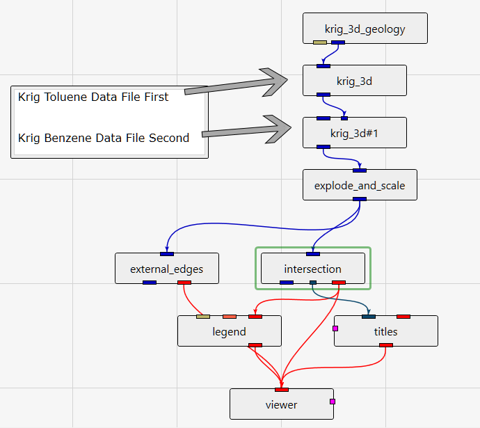 In the application below, the output of krig_3d is passed to the Input External Grid port of krig_3d#1. Each of the kriging modules reads its own unique data file and each can have unique settings, including unique variography settings. Using this methodology, even when different analytes are in the same data file, you can krige each of them with different variograms or other settings by choosing the corresponding “Data Component” within the file.
