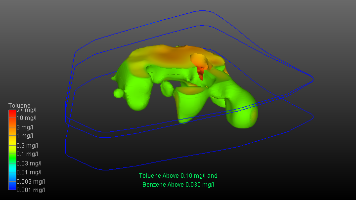 The output this application creates is shown below. Note that when you perform and intersection (or a union) you can only color the plume by one analyte (it doesn’t have to be one of those used in the intersection, but it usually would be). In this case we are coloring by Toluene as shown in the legend.