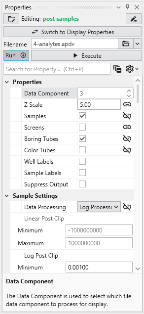 The Switch to Display Properties button allows quick switching between the properties of the selected module and the properties of the primary red output port of it, if it has one. This is the same as double-clicking on the primary red port, but allows faster swapping right within the Properties window.
