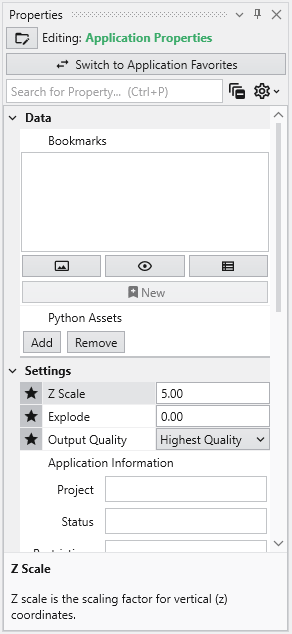 The Properties window is the primary interface in Earth Volumetric Studio for viewing and editing the parameters of various objects within your application. These objects can include modules, output ports, or the application itself. All properties for a selected object are displayed here, organized into logical, collapsible categories.