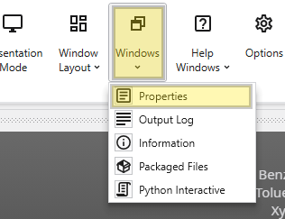 If the Properties window is not already open, navigate to the Windows button in the Main Toolbar to show it.