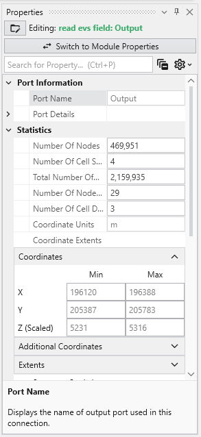 Field Port Properties In Earth Volumetric Studio, a blue port is a Field Port. It is the most common port type and is responsible for passing grid structures and their associated data between modules. A “field” contains the geometry (nodes and cells) as well as any data values defined on that grid, such as analytical results or material properties.