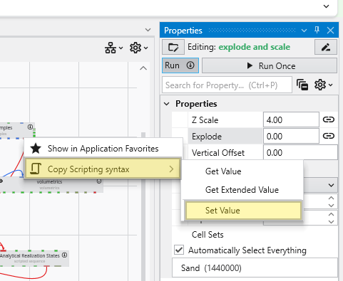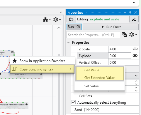 You can programmatically read and set the properties of any module using Python Scripting. This is a powerful feature for automating workflows and creating complex interactions between modules. The scripting engine provides programmatic access to the same underlying properties that are exposed as controls in the Properties window. This allows scripts to read, evaluate, and update values, mirroring manual user interaction. The easiest way to script a property is to copy the required syntax directly from the Properties window.