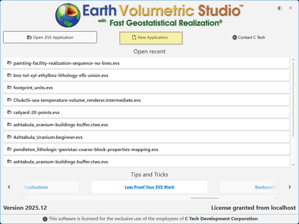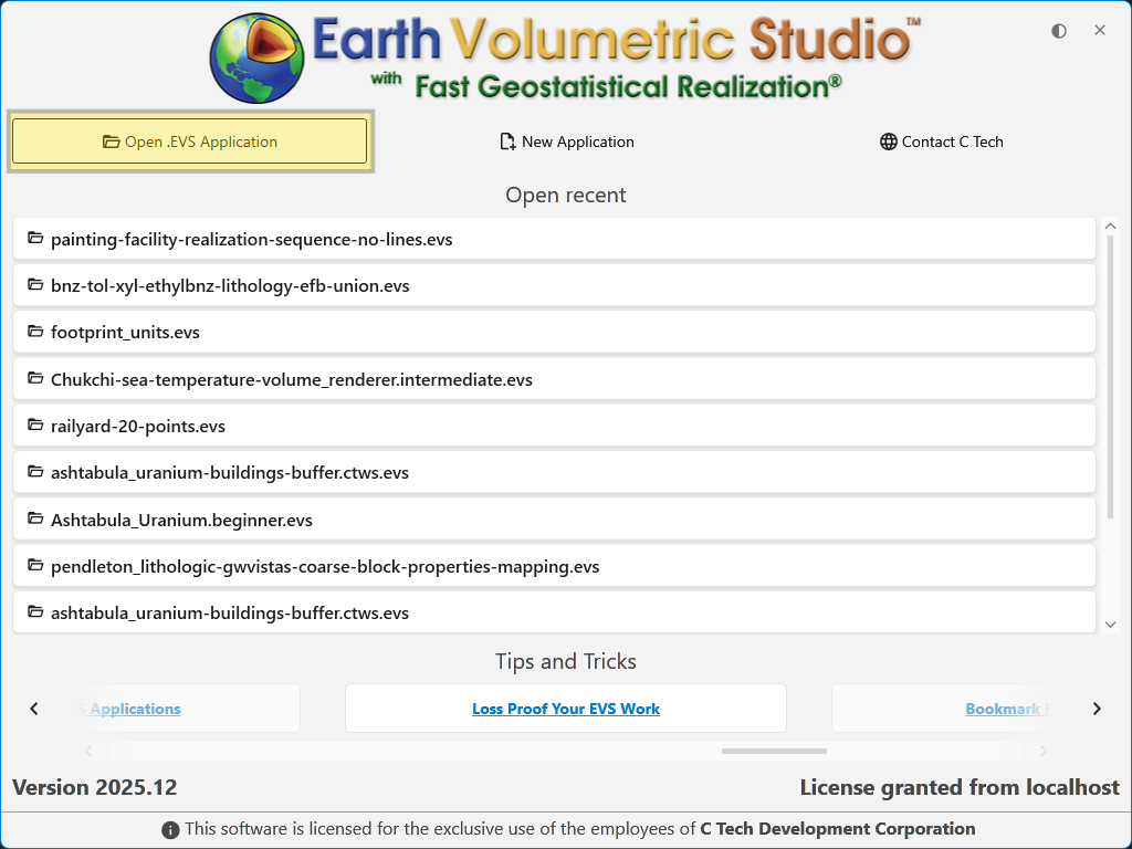 The Earth Volumetric Studio startup window is your launchpad for any project. From here, you can start with a clean slate by creating a new application, jump back into a previous project by opening an existing file, or access helpful resources.