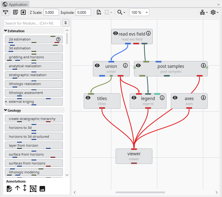 The Module Library contains a comprehensive list of all available modules, organized into categories such as Estimation, Geology, and Annotations. To build your application, you can find the desired module in the library and drag it onto the Application Network canvas.