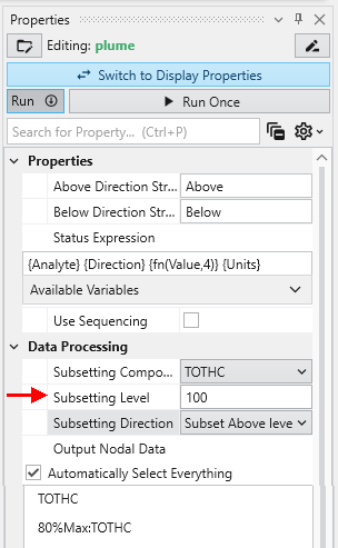You can easily customize this filtering behavior. To demonstrate, select the plume module by double-clicking it. In the Properties window, set the Subsetting Level to 100.