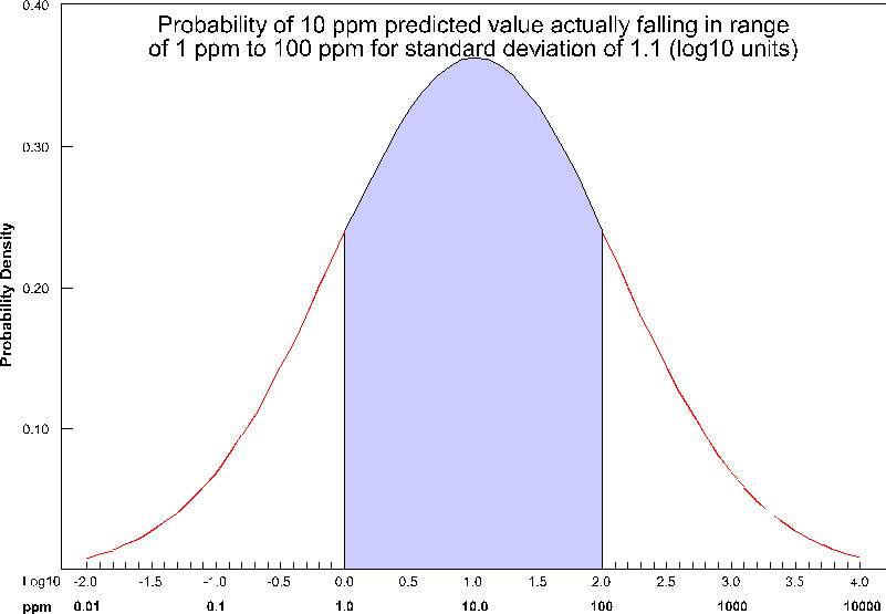 The actual calculation to determine confidence requires the standard deviation of the estimate at a node, and the Statistical Confidence Factor. The figure below shows the confidence (as the shaded area under the “bell” curve) for a Statistical Confidence Factor of 10 at a node where the predicted concentration was 10 ppm (1.0 as a log10 value) and the standard deviation for this point was 1.1 (in log10 units). For this example, the confidence would be ~64%, which means that 64% of the time, the value would lie in the shaded region.