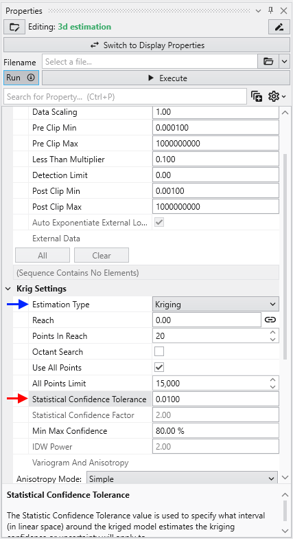 For example, consider the case where we are estimating soil porosity, and the input data values are ranging from 0.12 to 0.29. We would want to use “Linear Processing”, and since our values fall within a tight range of numbers we might want to use a “Statistical Confidence Tolerance” that was 0.01. The confidence values we would compute would then be based upon the following question: