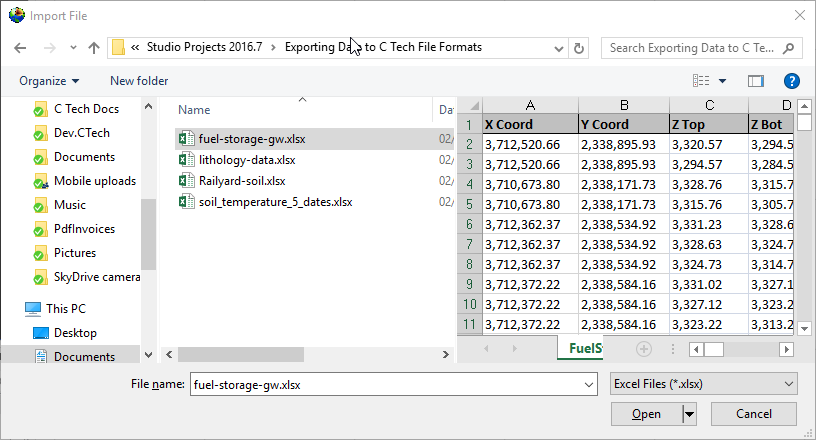 Let’s browse to the folder shown and select the file fuel-storage-gw.xlsx since we mentioned that this file had three surface which we can use for stratigraphic geology. In this case the three surfaces define just two layer which correspond to the vadose and saturated regions, however, that is an important minimal geology file for working with groundwater data.