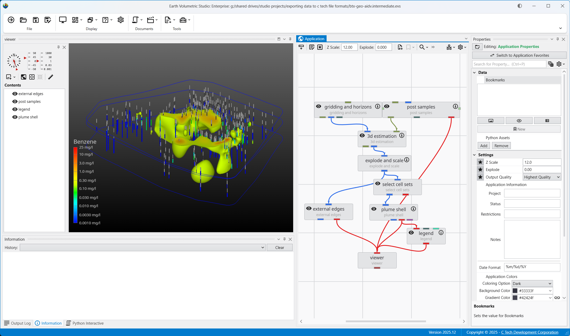 We’ve kriged groundwater data into both layers of our model. However it doesn’t make sense to ever display or do any volumetric analysis of groundwater data in the vadose zone. We could have used the subset horizons module to get only the single bottom layer corresponding to the saturated zone (aquifer) but if we did that, we wouldn’t have both stratigraphic layers which we are displaying with the external_edges module and could display with a variety of other techniques. In that case we would need to create a parallel path in our application where we would use horizons to 3d to create either the top layer only or both layers in order to display the geology separate from the groundwater chemistry.
