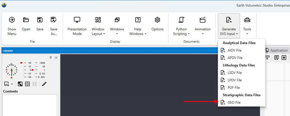 Begin by selecting the “Generate EVS Input” button in the Main Toolbar, and select GEO File.