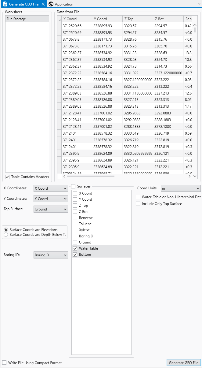 Based on the values for both surfaces, it is clear they are Elevations and not Depths. For the Surfaces selectors, we don’t choose Ground because it is already selected as the Top Surface. This file will have three surfaces defining two layers.