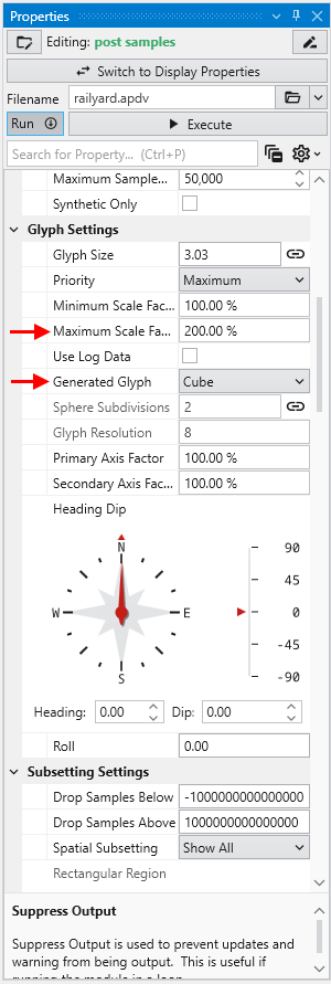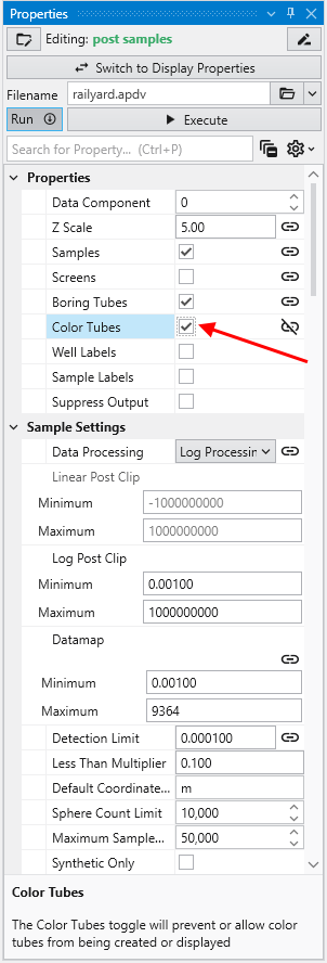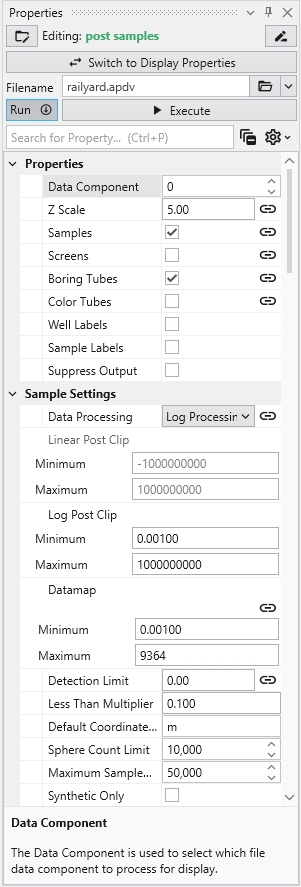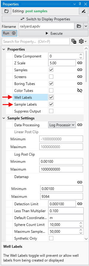 Double click on post samples to open its Properties window. Select Analytic and Stratigraphic Modeling\railyard.apdv and change the Z Scale to 5 on the Application window or Application Properties.