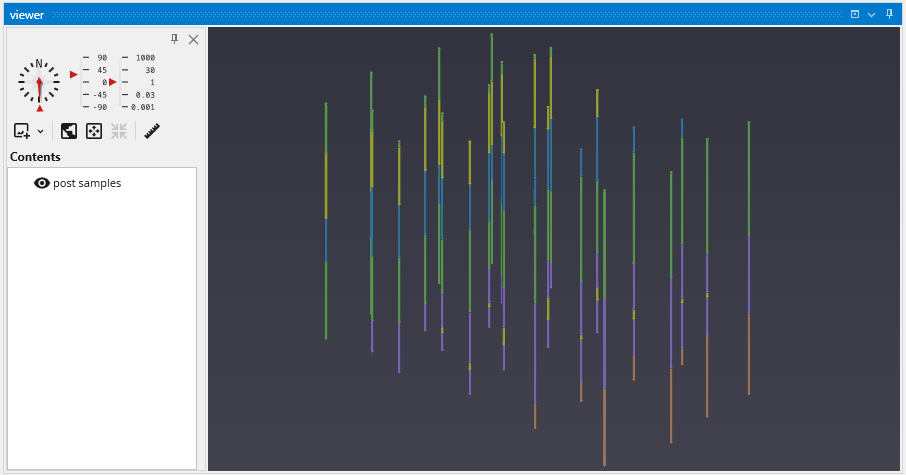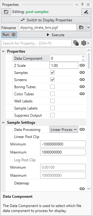 post samples will automatically adjust many of its settings based on the type of file read. Click on the Open button and browse to the Lithologic Geologic Modeling folder in Studio Projects and select dipping_strata_lens.pgf.