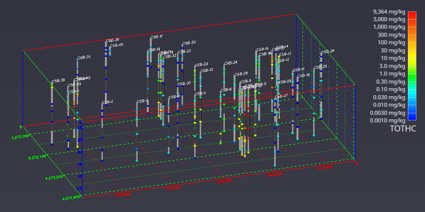 When representations of the borings are added, the figure becomes much more useful. Figure 1.6 shows the sample represented by colored spheres and tubes represent the borings. The tubes are colored alternating dark and light gray where the color changes on ten-foot intervals. This provides a reference to allow the viewer to quickly determine the approximate depth of the samples. The borings are also labeled with their designation. These last two figures both represent the same data, however it is clear which one provides the most useful information.