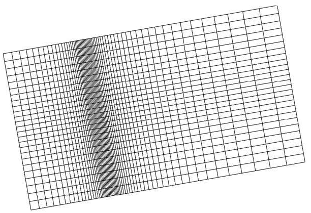 The following type of grid derives its name from the numerical methods that it employs. Simulation software such as the USGS’s MODFLOW utilizes a finite difference numerical method to solve equilibrium and transient ground water flow problems. This solution method requires a grid that contains only rectangular cells. However the cells need not be uniform in size. For two-dimensional grids, this results in rectangular cells, however it is possible that no two cells are precisely the same size. Some simulation software requires that finite difference grids be aligned with the coordinate axes. EVS does not impose this restriction, but it does provide a means to export the grid transformed so that the grid axes are aligned. Figure 1.11 shows a rotated 2D finite difference grid. Smaller cells are concentrated in areas of the model where there are significant gradients in the data. For groundwater simulations this is usually where wells are located. For environmental contamination it should be the location of spills or areas where DNAPL (dense non-aqueous phase liquids) contaminant plumes were detected. The smaller cells provide greater accuracy in estimating the parameter(s) of interest.