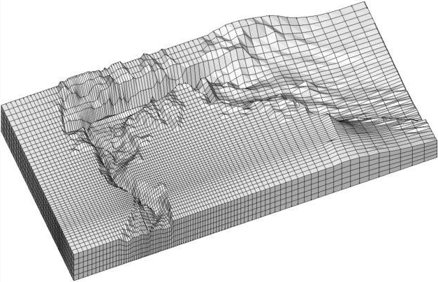 Three-dimensional finite difference grids have the same restrictions as 2D grids with respect to their x and y coordinates (cell width and length). However, the z coordinates of the grid (which define the cell thicknesses) are allowed to vary arbitrarily. This allows for creation of a grid that follows the contours of geologic surfaces. For a grid having i by j by k nodes there will be (i-1) * (j-1) * (k-1) hexahedron cells whose connectivity can be implicitly derived. However the coordinates of the nodes for this grid must be explicitly specified. Figure 1.12 shows the grid created to model the migration of a contaminant plume in a tidal basin.