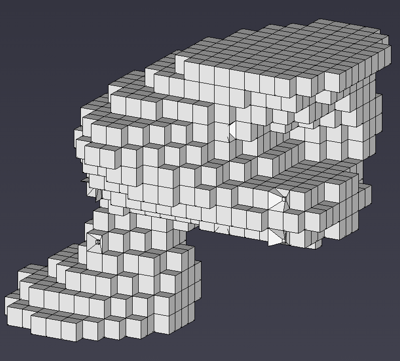 The refinement process can also be applied to all types of 3D grids. When a sample falls in a hexahedron (hex) cell, a new much smaller hex cell is created with one of its’ corners located precisely at the coordinates of the sample point. The eight corners of the small cell are connected to the corresponding corners of the parent cell. This creates 7 hex cells that fully occupy the volume of the original cell. Since the 3D-refinement process occurs internal to the volume of the model, it is more difficult to visualize the process. In order to see the refined cells, removing all cells in the grid with any nodes that were below a thresholded concentration level created Figure 1.16. By choosing the threshold properly, several of the refined cells become visible.