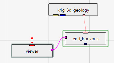 The method of connecting edit_horizons is unique among our modules. It uses the pink output port from gridding and horizons as its primary input, and it also requires the purple side port from viewer since it requires interactive probing. Its blue output port then becomes equivalent to the blue output of gridding and horizons, but with edited surfaces.