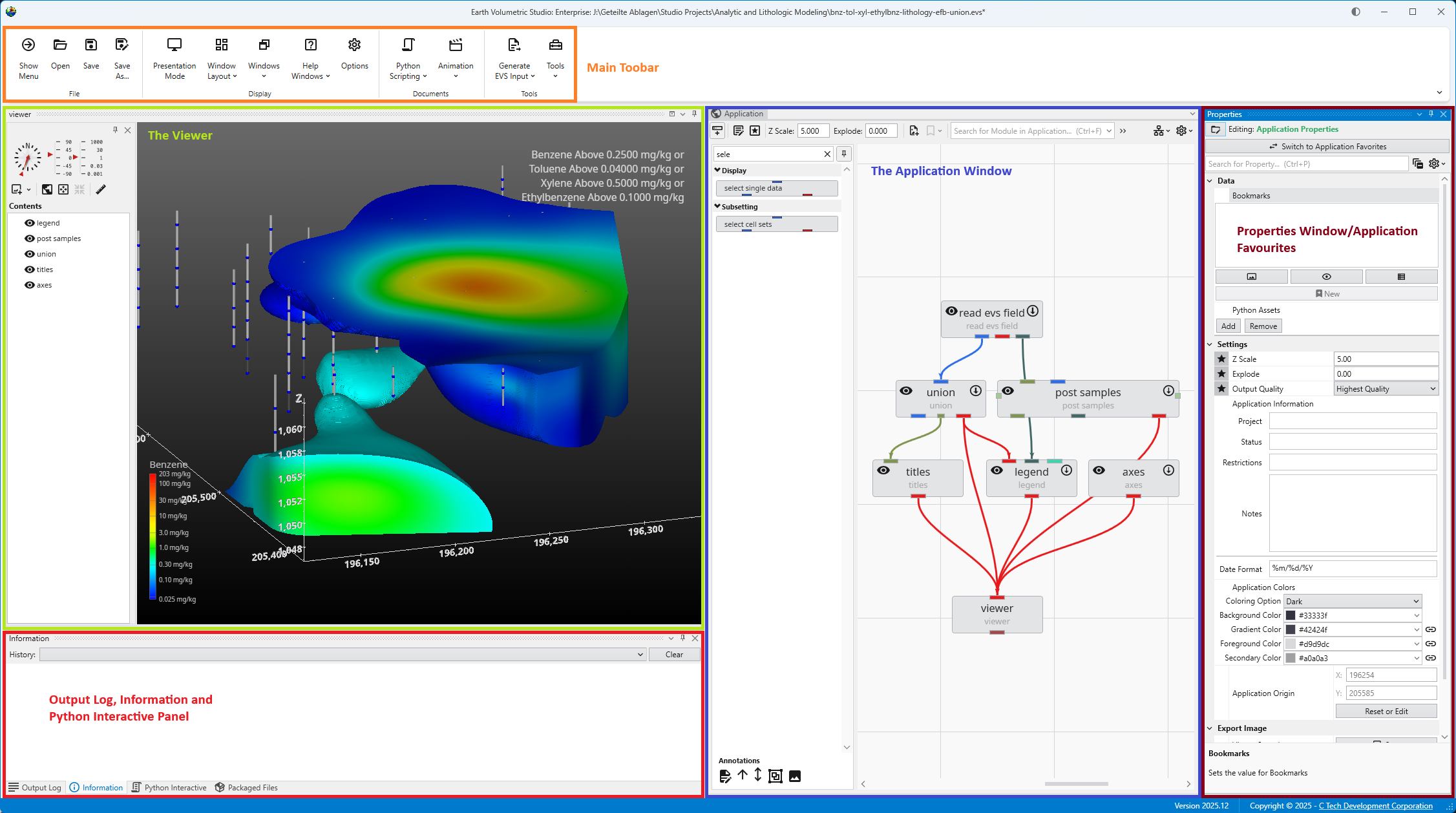 This multi-functional section allows you to configure every aspect of your project. When a module is selected in the Application Window, this panel displays all of its configurable parameters, allowing you to control how it processes data. You can also modify global settings that affect the entire project, such as adjusting the vertical exaggeration with z-scale or separating objects for better visibility with an explode factor. This area also lets you save and manage specific camera positions as bookmarks, enabling you to quickly return to important views. The Application Favorites allows you to build a custom collection of frequently used or important module and application properties.