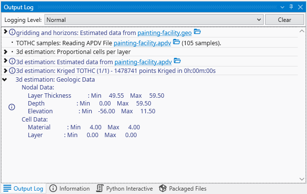 3. Summary Statistics: After a process completes, modules often output summary statistics directly to the log. As shown in the image, an expanded entry for “Geologic Data” displays the minimum and maximum values for Nodal Data (like Layer Thickness) and Cell Data (like Material), providing a quick quality check of the results.