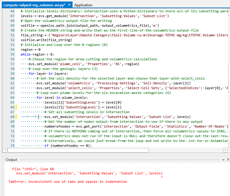 Python is a Whitespace sensitive programming language that uses “spaces” and indenting instead of curly braces or “begin/end” keywords. The version of Python used in Earth Volumetric Studio requires that spaces be used instead of a mix of tabs and spaces for indenting.