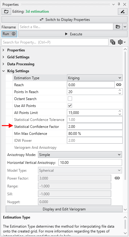 For example, consider the case where we are estimating soil porosity, and the input data values are ranging from 0.12 to 0.29. We would want to use “Linear Processing”, and since our values fall within a tight range of numbers we might want to use a “Statistical Confidence Tolerance” that was 0.01. The confidence values we would compute would then be based upon the following question: