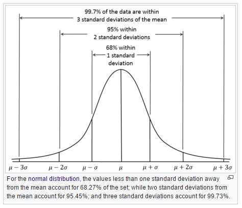 The figure below shows why one standard deviation corresponds to 68% of the occurences, whereas three sigma (standard deviations) covers 99.7%