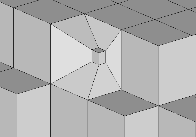 The refinement process can also be applied to all types of 3D grids. When a sample falls in a hexahedron (hex) cell, a new much smaller hex cell is created with one of its’ corners located precisely at the coordinates of the sample point. The eight corners of the small cell are connected to the corresponding corners of the parent cell. This creates 7 hex cells that fully occupy the volume of the original cell. Since the 3D-refinement process occurs internal to the volume of the model, it is more difficult to visualize the process. In order to see the refined cells, removing all cells in the grid with any nodes that were below a thresholded concentration level created Figure 1.16. By choosing the threshold properly, several of the refined cells become visible.