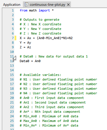 The equation(s) used to modify data and/or coordinates must be input as part of a Python Script. The module will generate a default script and by modifying only one line (for the X coordinate)we get: