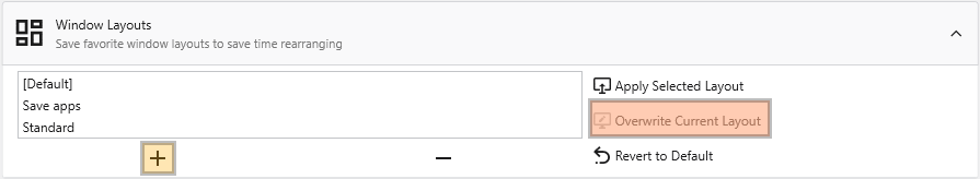 - Create a new layout: Click the + (Add) button to save your current window arrangement as a new layout. It will appear in the list along with any previously saved layouts and the “Default” configuration.