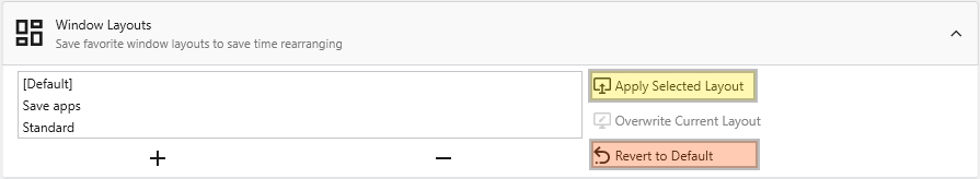 - Load a layout: Select the desired layout and click the Apply Selected Layout button or alternatively revert to the “Default” layout using the Revert to Default button.