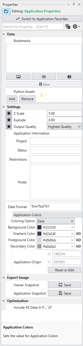 | Application Origin | Defines the spatial anchor for the project coordinates. The first time a file is read, the origin will be set based off the coordinates of that data. Everything is then computed relative to the application origin from then on in order to maintain the best precision for 3d calculations. If you reuse an application and change the data, you must reset the application origin. | |