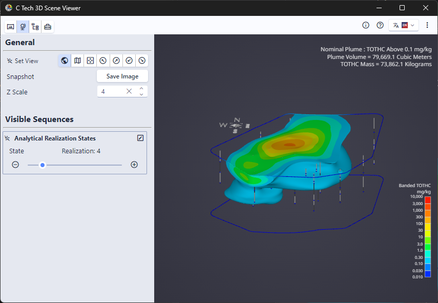 It is important to understand that these states are discrete. The application creator defines exactly which states are included in the sequence. For example, if you create a plume sequence with concentration levels of [0.01, 0.1, 1.0, and 10.0], the user can only select those specific four levels; it would not be possible for them to view the plume at a level of 3.0.