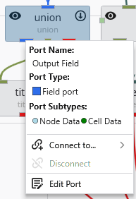 Ports are color-coded to indicate the type of data they handle, and you can only connect ports of a similar color. While there are many port types, the two most critical and frequently used are Field ports and Renderable Object ports.