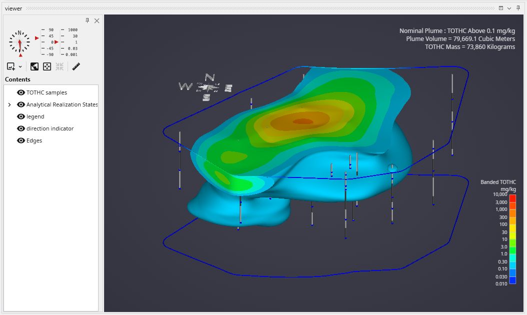 The Viewer is the primary 3D visualization window in Earth Volumetric Studio. It serves as the canvas where all the visual outputs from your Application Network - such as geologic layers, contaminant plumes, sample data, and annotations - are rendered and combined into a single, interactive scene. This is the main environment for exploring, analyzing, and presenting your 3D model.